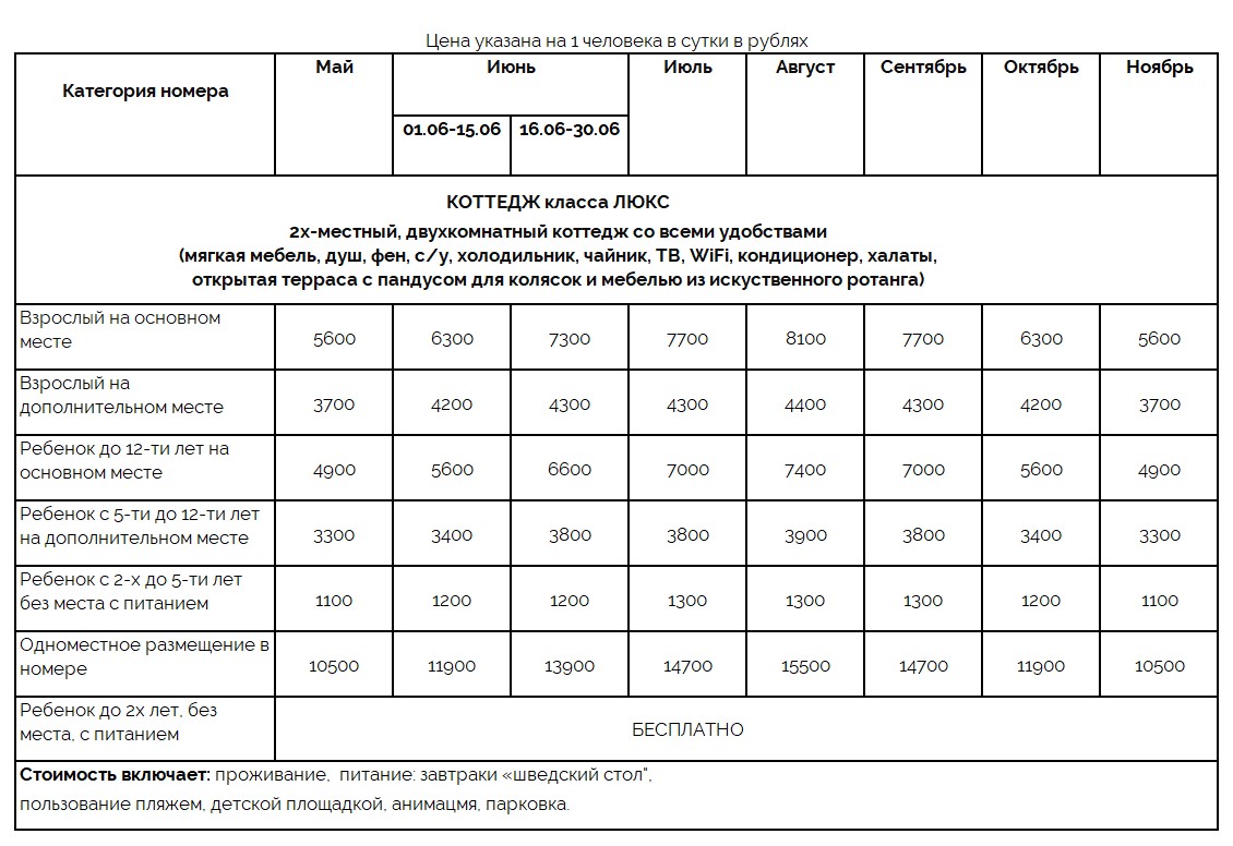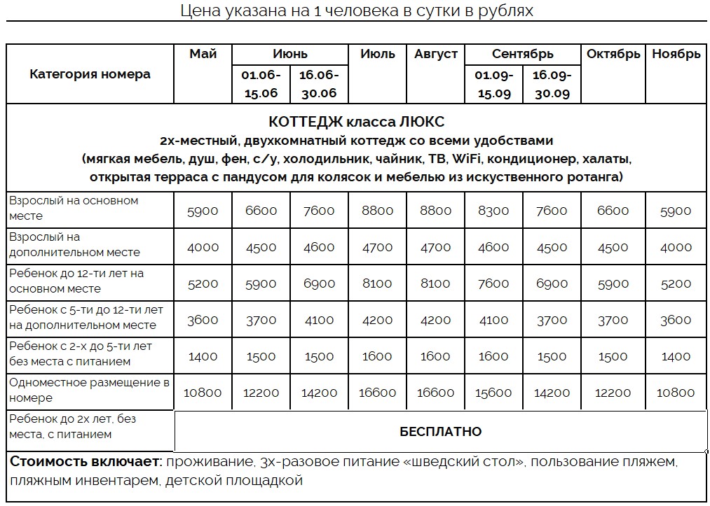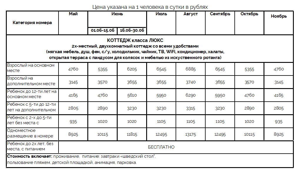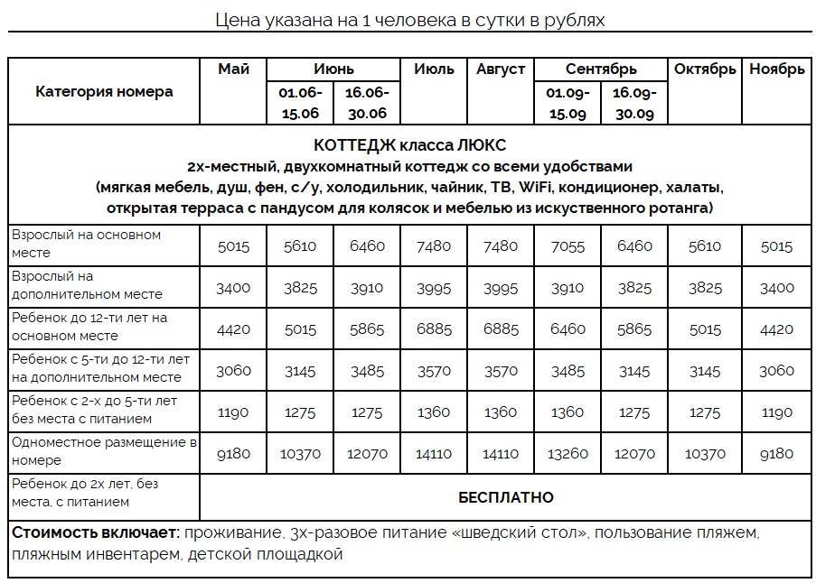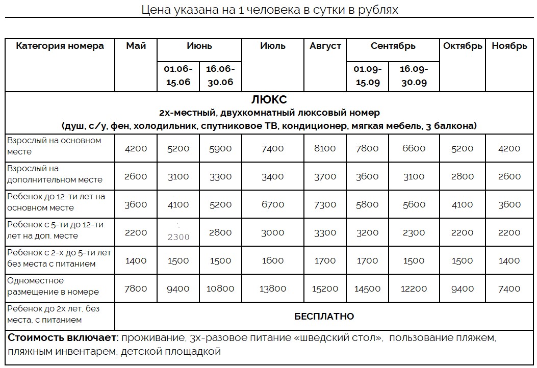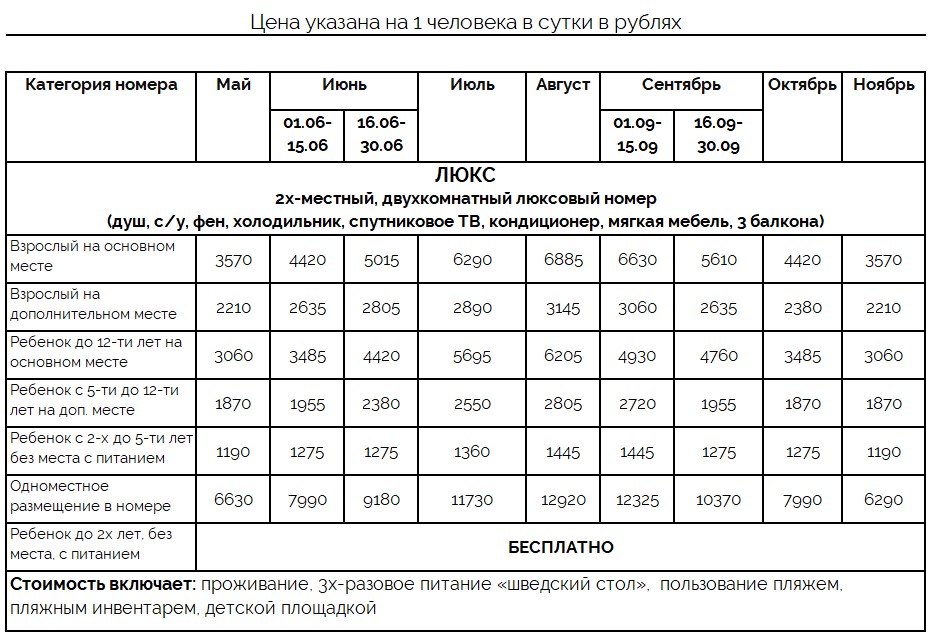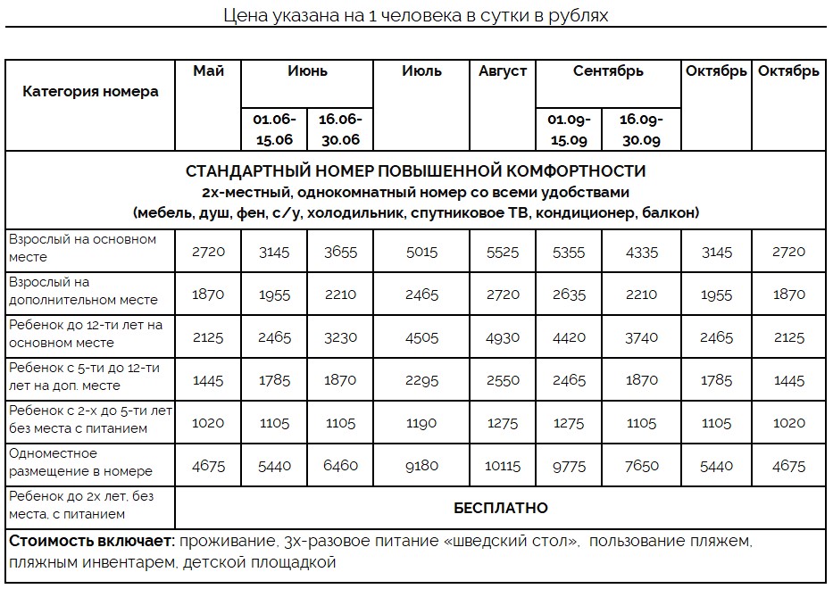 | Цена включает: проживание, 3х-разовое питание «шведский стол», пользование пляжем, пляжным инвентарем, детской площадкой | |||||||||