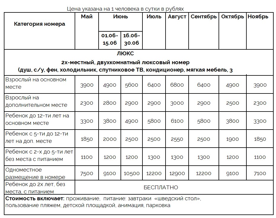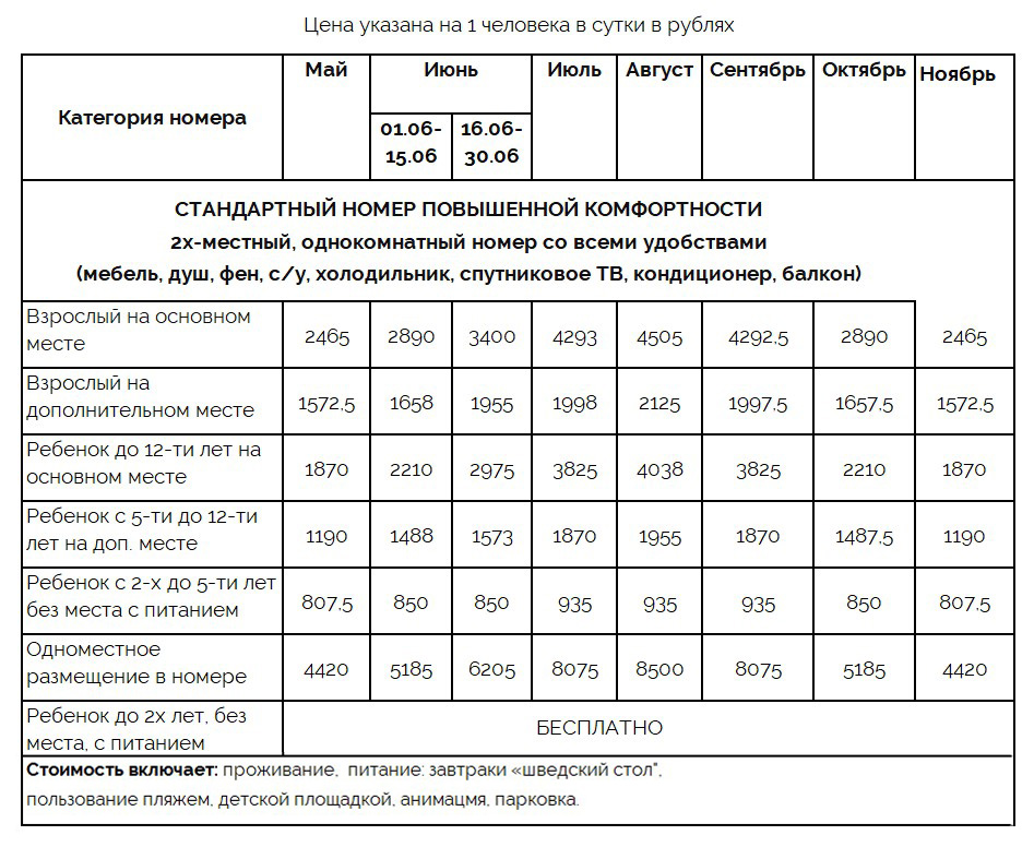 | Цена включает: проживание, 3х-разовое питание «шведский стол», пользование пляжем, пляжным инвентарем, детской площадкой | ||||||||